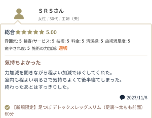 先日は、当店の台湾式足つぼ デトックスリフレクソロジー レッグスリム60分コースを受けて頂きありがとうございました。