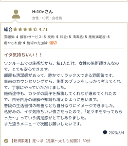 当店での足つぼは、足裏の反射区やリンパケアはもちろん、筋肉の状態を見てほぐしながら緩めたり、足の関節のストレッチ等含めて施術いたしております。