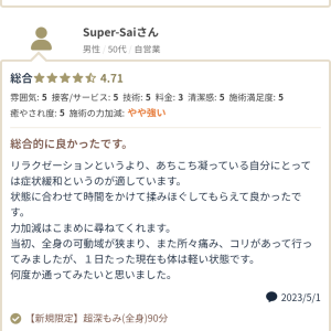 施術中は、昔から身体の凝りでお悩みで、色々なリラクゼーションマッサージを体験されている話など聞かせていただきありがとうございました。