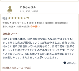 初体験の【深もみ】だったかと思いますが、このほぐしは強い力加減でほぐして痛みを感じるのではなく、コリなどにより血行不良で硬くなっている筋肉をもみほぐし緩めている段階で痛み(強くほぐされている様に感じる)を感じやすいですが、筋肉がゆるんでくると、施術途中から直ぐに強さ加減も心地よく身体もぽかぽか感じて貰いやすいです。
