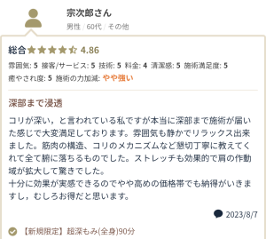 当店の”深もみ”が、宗次郎さまにとって心地よいものに感じて頂きとても嬉しく思っております。
