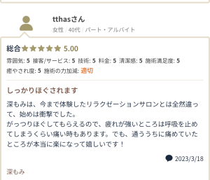 tthasさまが最初感じられてた施術の強さも、筋肉がほぐれて血行が促されてくる度に、少しずつ強さの衝撃も薄れてゆき、徐々に程よい痛気持ちよさ(施術する時の強さ加減は変えてませんが、ほぐれてくると痛みが薄れ、本来の好みの強さ加減)に変わってきてるかと思います。