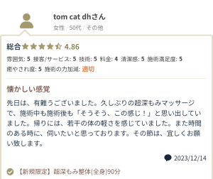 【お客様の声】リラクゼーション的なほぐしが多い現在ですが、昔懐かしいしっかりとした施術のサロンです
